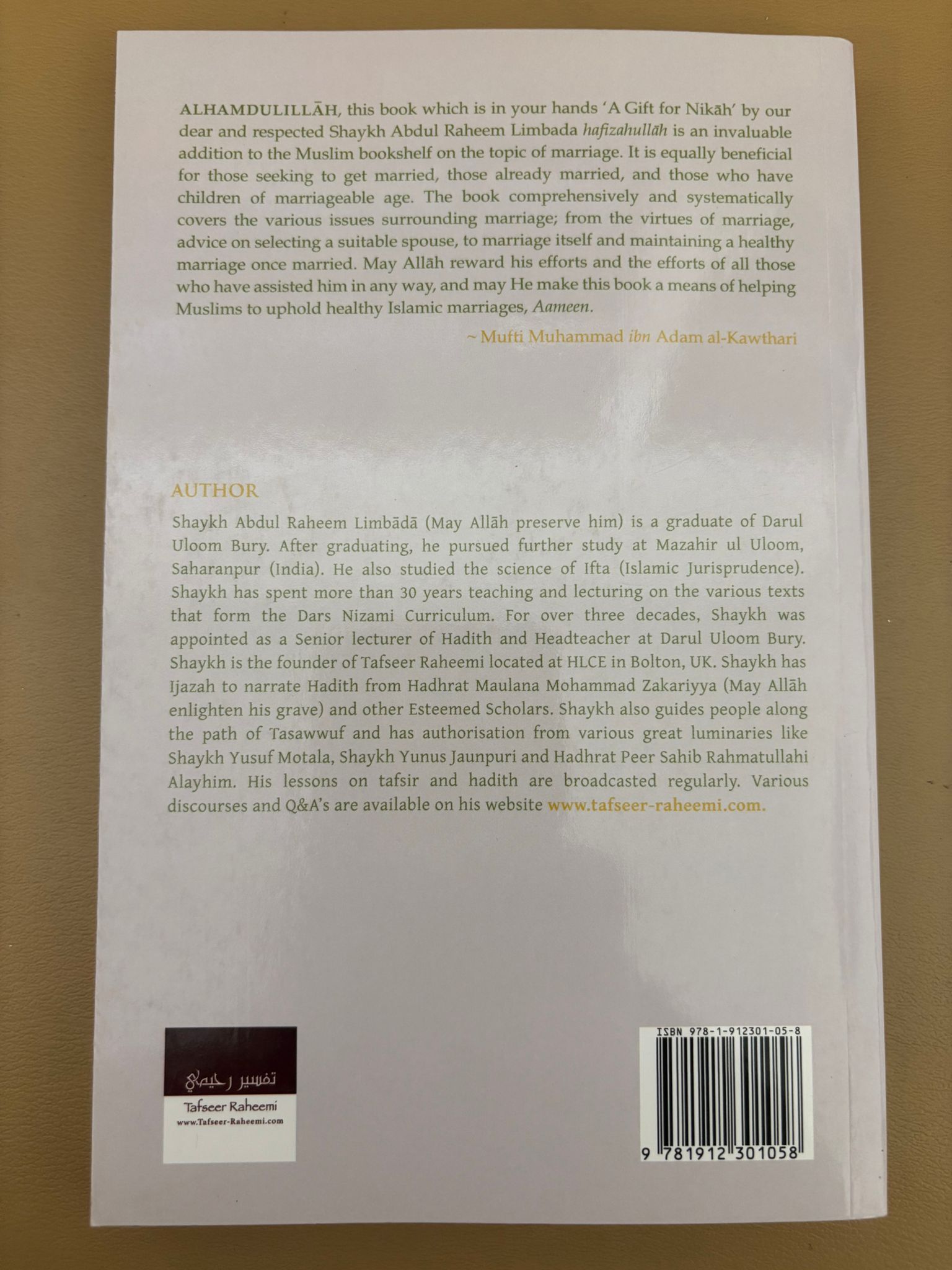 Alhamdulillāh, this book which is in your hands ‘A Gift for Nikāh’ by our dear and respected Shaykh Abdul Raheem Limbada (Hāfizahullāh) is an invaluable addition to the Muslim bookshelf on the topic of marriage. It is equally beneficial for those seeking to get married, those already married, and those who have children of marriageable age. The book comprehensively and systematically covers the various issues surrounding marriage; from the virtues of marriage, advice on selecting a suitable spouse, to marriage itself and maintaining a healthy marriage once married. May Allāh SWT reward his efforts and the efforts of all those who have assisted him in any way, and may He make this book a means of helping Muslims to uphold healthy Islamic marriages, Ameen.