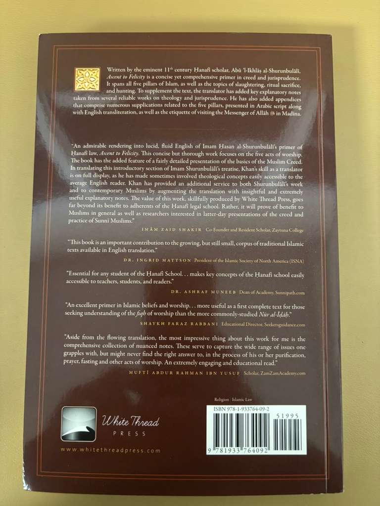 Ascent to Felicity (Arabic: Maraqi al-Sa‘adat) is a concise Hanafi fiqh (Islamic jurisprudence) manual written by the Ottoman scholar Abu’l Ikhlas Hasan ibn Ammar al-Shurunbulali (d. 1659). It provides a clear, structured summary of the rulings related to worship, transactions, marriage, and other aspects of daily life according to the Hanafi school of law. The book is valued for its simplicity and accessibility, making it a popular introductory text for students of Islamic law.