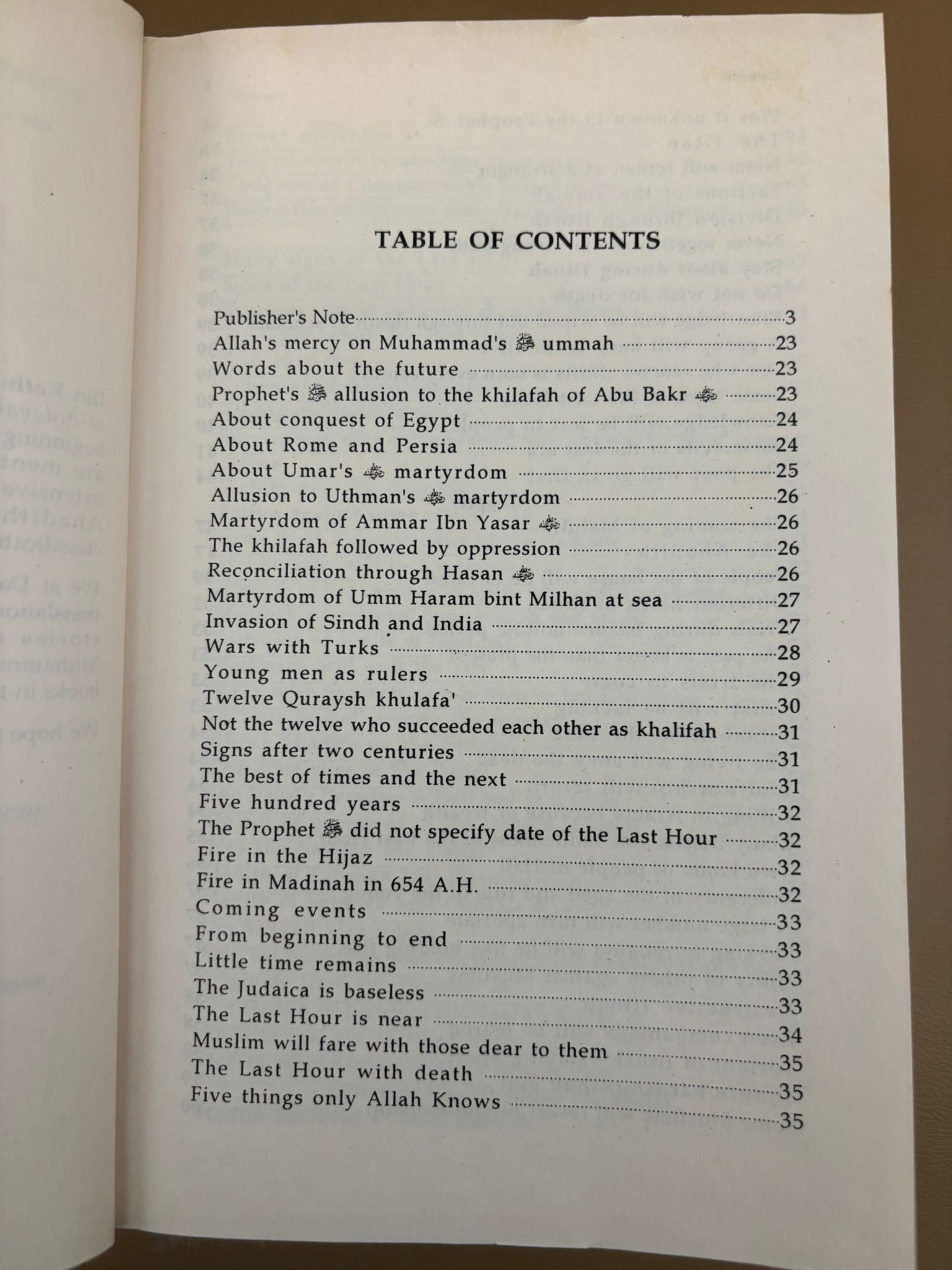 All major signs of Qiyamah are described in this book. Authentic Ahadith, as well as verses from the Qur'an, are cited, and Ibn Kathir explains them in vivid language. It includes the Prophet’s (S.A.W.) predictions of future events, such as the Roman and Persian battles, the trial faced by Uthman Ibn Affan, Umm Haram’s martyrdom in a sea battle, the fire in Madinah, the survival of a faithful group until the Last Hour, some evils of the final days, the rising of the sun in the west, and the Day of Resurrection itself.