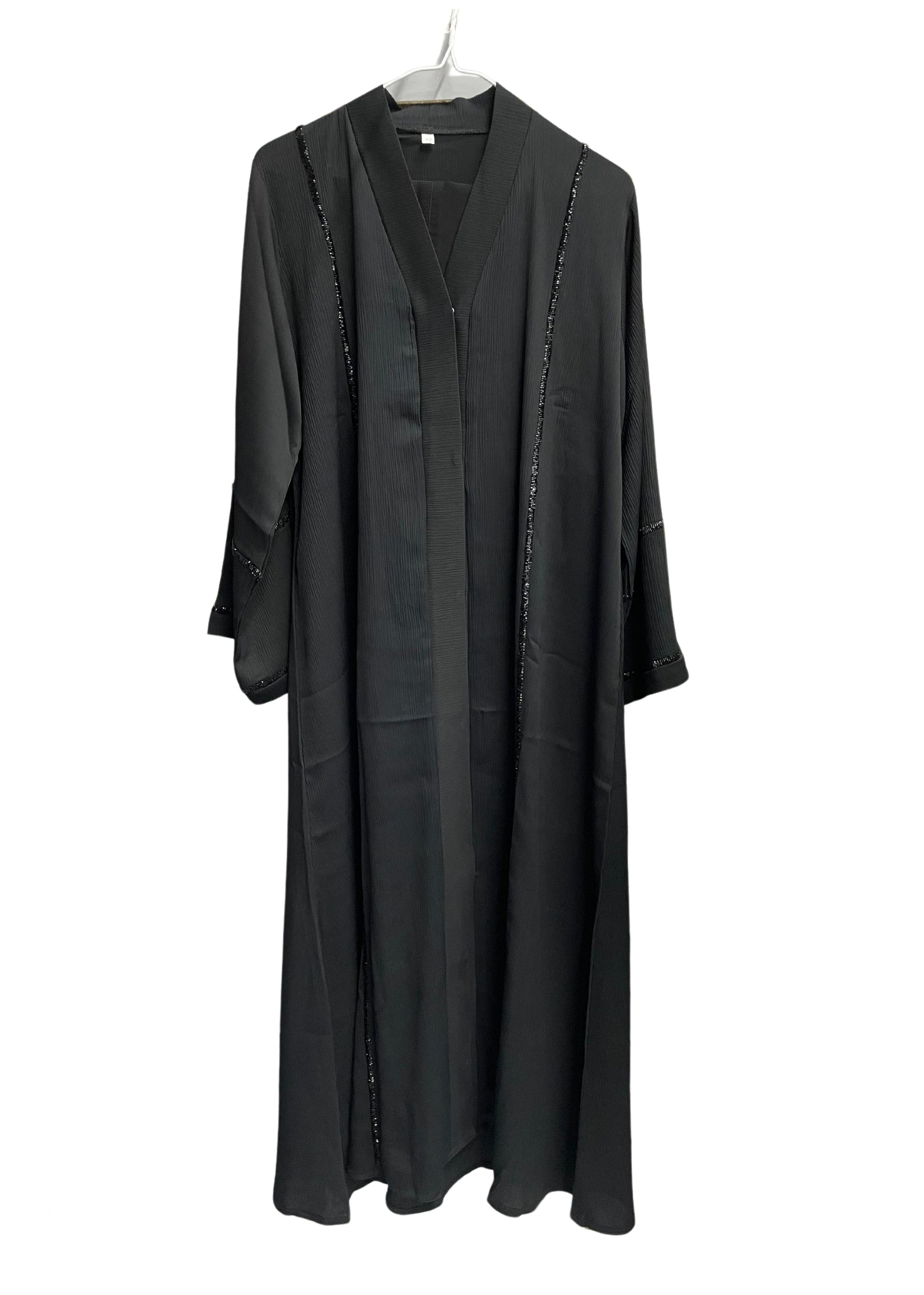 This black button-up abaya features sequined stripes that run vertically up the fabric, adding a sleek and modern touch. The subtle shimmer of the sequins enhances the elegant design, making it perfect for both everyday wear and special occasions.
