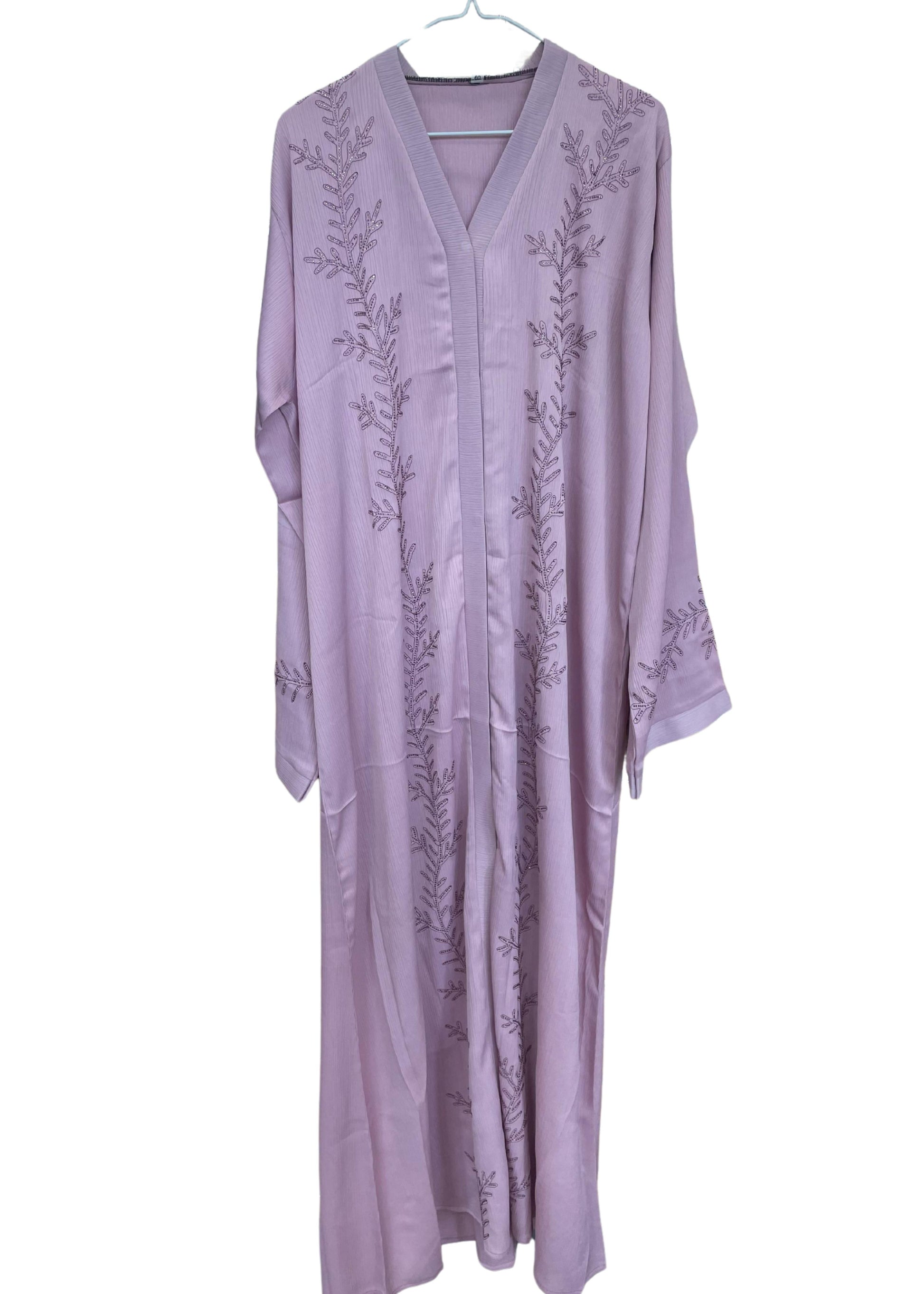 This silky abaya features a delicate branch design that adds a touch of nature-inspired detail. Perfect for both special occasions and refined everyday wear.